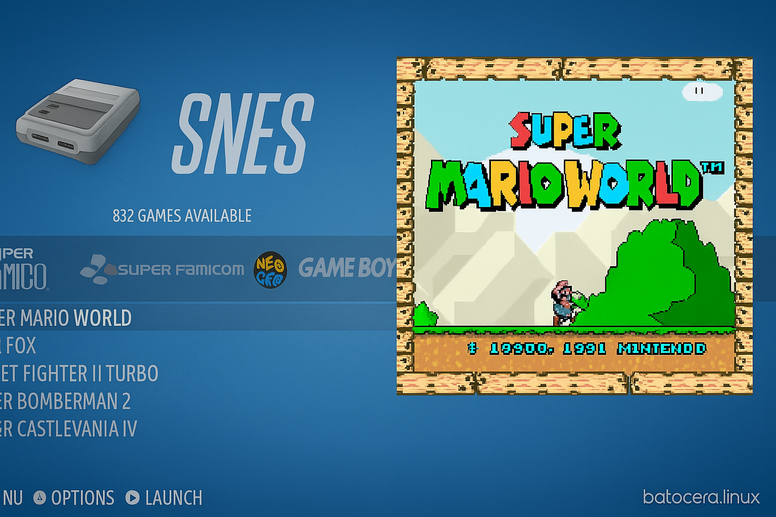 O Batocera destaca-se por ser um sistema plug-and-play, ou seja, pode ser executado diretamente a partir de um cartão microSD ou SSD, sem necessidade de instalação no dispositivo. Além disso, tem uma interface gráfica simples, intuitiva e altamente personalizável, o que facilita a navegação mesmo para utilizadores menos experientes. Vantagens do Batocera: Suporte a múltiplas plataformas: Emula uma vasta gama de consolas e computadores antigos, desde os clássicos da Nintendo (NES, SNES, N64), Sega (Mega Drive, Saturn, Dreamcast), Sony (PS1, PSP), até sistemas como o Atari, Neo Geo, Amiga, MS-DOS, entre outros. Interface EmulationStation.